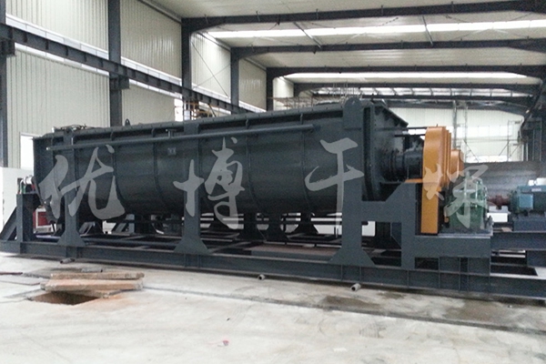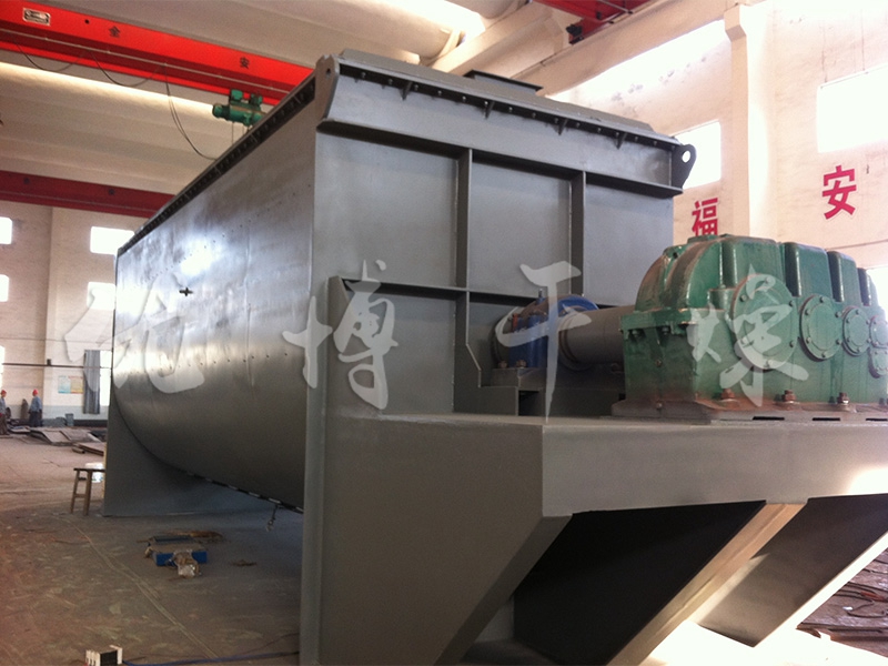 空心軸上密集排列著楔型中空漿葉,熱介質(zhì)經(jīng)空心軸流經(jīng)漿葉。單位有效容積內(nèi)傳熱面積很大,熱介質(zhì)溫度從-40℃到320℃,可以是水蒸汽,也可以是液體型:如熱水、導熱油等。間接傳導加熱,沒有攜帶空氣帶走熱量,熱量均用來加熱物料。熱量損失僅為通過器體保溫層向環(huán)境的散熱。楔型漿葉傳熱面具有自清潔功能。物料顆粒與楔型面的相對運動產(chǎn)生洗刷作用,能夠洗刷掉楔型面上附著物料,使運轉(zhuǎn)中一直保持著清潔的傳熱面。漿葉干燥機的殼體為Ω型,殼體內(nèi)一般安排二到四根空心攪拌軸。殼體有密封端蓋與上蓋,防止物料粉塵外泄而充分發(fā)揮作用。