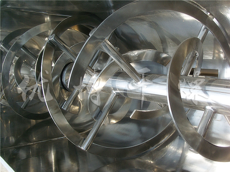 臥式螺帶混合機由安裝于攪拌軸上的內外徑螺旋帶動桶體內物料翻動,使攪拌器在桶體內大范圍翻動物料。攪拌器結構上,螺旋設計成內外、左右互為反螺旋,攪拌器工作時內螺旋帶動靠近軸心處物料做軸心旋轉,軸向由內至兩側推動,外螺旋帶動靠近筒壁物料做軸心旋轉,軸向由兩側至內推動,于是造成物料在筒體內對流循環、剪切滲混,完成物料在較短時間內快速均勻混合。