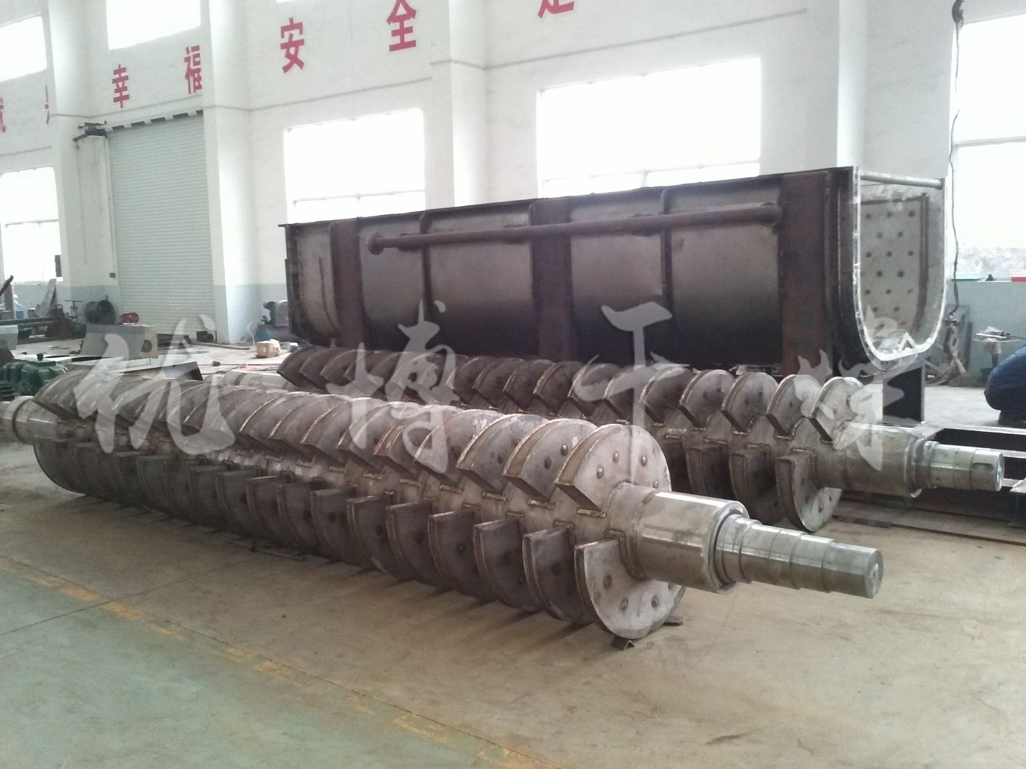 空心軸上密集排列著楔型中空漿葉,熱介質(zhì)經(jīng)空心軸流經(jīng)漿葉。單位有效容積內(nèi)傳熱面積很大,熱介質(zhì)溫度從-40℃到320℃,可以是水蒸汽,也可以是液體型:如熱水、導(dǎo)熱油等。間接傳導(dǎo)加熱,沒(méi)有攜帶空氣帶走熱量,熱量均用來(lái)加熱物料。熱量損失僅為通過(guò)器體保溫層向環(huán)境的散熱。楔型漿葉傳熱面具有自清潔功能。物料顆粒與楔型面的相對(duì)運(yùn)動(dòng)產(chǎn)生洗刷作用,能夠洗刷掉楔型面上附著物料,使運(yùn)轉(zhuǎn)中一直保持著清潔的傳熱面。漿葉干燥機(jī)的殼體為Ω型,殼體內(nèi)一般安排二到四根空心攪拌軸。殼體有密封端蓋與上蓋,防止物料粉塵外泄而充分發(fā)揮作用。
