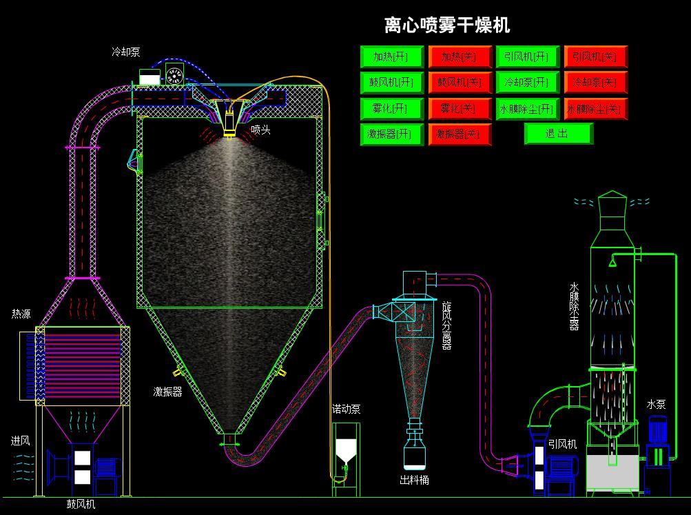 噴霧干燥機為開式循環,并流式,離心式霧化。干燥介質空氣經過初、中效空氣過濾器過濾后根據操作指令由鼓風機吸取再經加熱器加熱通過高效過濾器的熱風分配器進入噴霧干燥主塔。液體物料根據操作指令經過蠕動泵,進入高速旋轉的離心噴頭,在離心力作用下被分散成小霧滴。在噴霧干燥主塔內,小霧滴與熱風在充分接觸,沿其特定路徑進行熱交換后被干燥成為產品,然后通過旋風分離器實現分離,固體物料被收集,氣體介質再經過過濾后被排出。整套噴霧系統易清潔、無死角,符合GMP要求。
